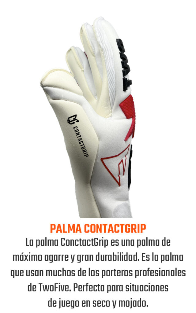 Palma de máximo rendimiento suministrada a nuestros porteros patrocinados para competir en ligas profesionales. Palma de competición con el mejor agarre en cualquier condición climática. 3.5mm látex German ContactGrip + 4mm foam. Sensación de agarre firme. Gel interno Anti-Slip para aumentar el tacto con el balón y limitar los micro-movimientos de la mano dentro del guante.