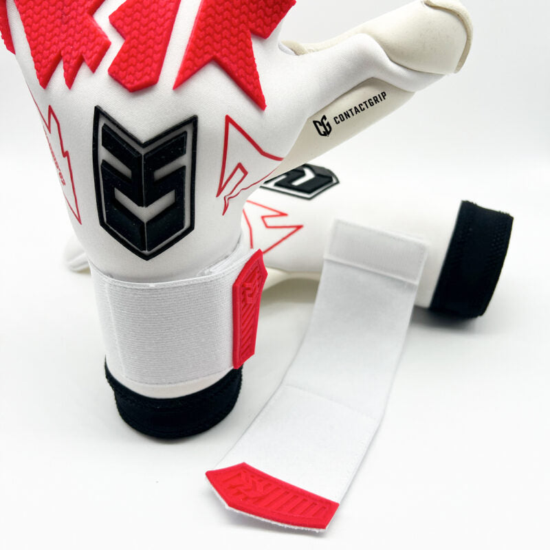 Tira elástica opcional con dos puntos de anclaje. Muñequera elástica que se ajusta perfectamente al contorno de la muñeca. Incluye tira de cierre de vuelta completa, opcional para los porteros que deseen mayor ajuste.